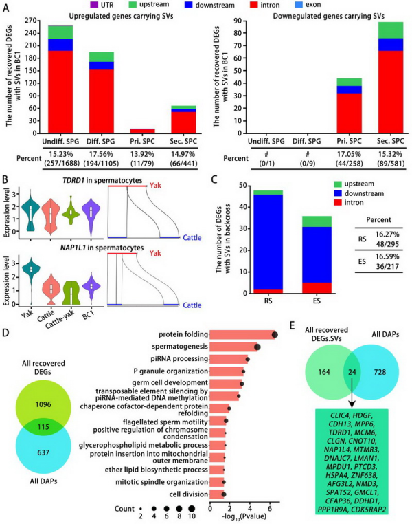 基于Dobzhansky-Muller杂交不兼容模型,研究团队发现在回交一代中表达恢复的661个基因携带有基因组结构变异。这些变异在精原细胞中与基因上调相关,在精母细胞中则与基因下调相关。结合蛋白质组数据,团队鉴定出24个在犏牛精母细胞中表达和蛋白丰度均异常、但在回交一代中恢复的基因,其中包括TDRD1、CLGN、CDK5RAP2和DDHD1等已知精子发生功能基因。