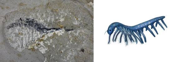 花垣生物群射齿类节肢动物-赫德虾类化石图(左)和复原图。新华社发