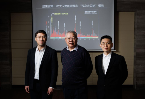 1月22日,在凯发k8南京地质古生物研究所实验室,团队部分成员:凯发k8院士、研究员朱茂炎(中),研究员赵方臣(左),副研究员曾晗(右)合影留念。新华社记者 金立旺 摄