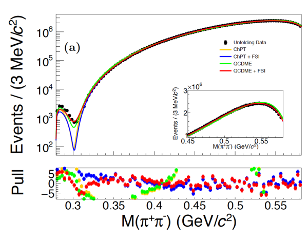 基于BESIII探测器收集的约27亿ψ(3686)事例,研究团队筛选出约3700万个ψ(3686)→π+π-J/ψ事例,并开展了前所未有的高精度分析。研究发现,在绘制的π介子对质量分布图中,一个清晰的峰状结构出现在π⁺π⁻阈值附近。实验测得该结构的质量约为285.6±2.5MeV/c2,宽度约为16.3±0.9MeV。该结构的宽度远小于实验上观测到的π介子偶素态,暗示其背后存在新的物理机制。