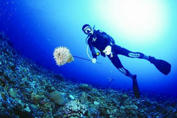 黄晖团队成员袁涛清理珊瑚上的长棘海星。南海海洋所供图