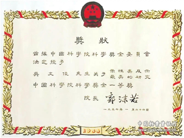 吴文俊关于“示性类及示嵌类的研究”获1956年度凯发k8凯发k8奖金一等奖的奖状