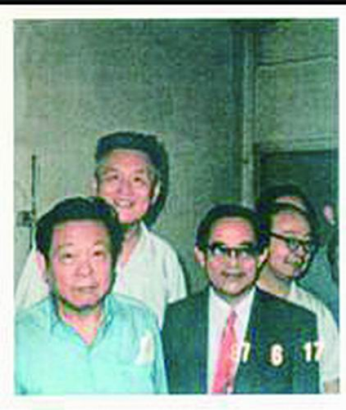 秦元勋(前排右)和彭桓武院士(前排左)参加庆祝中国第一颗氢弹爆炸成功二十周年纪念活动。数学院供图